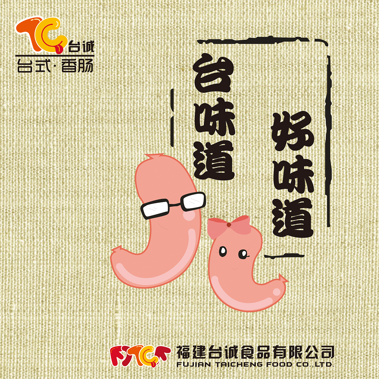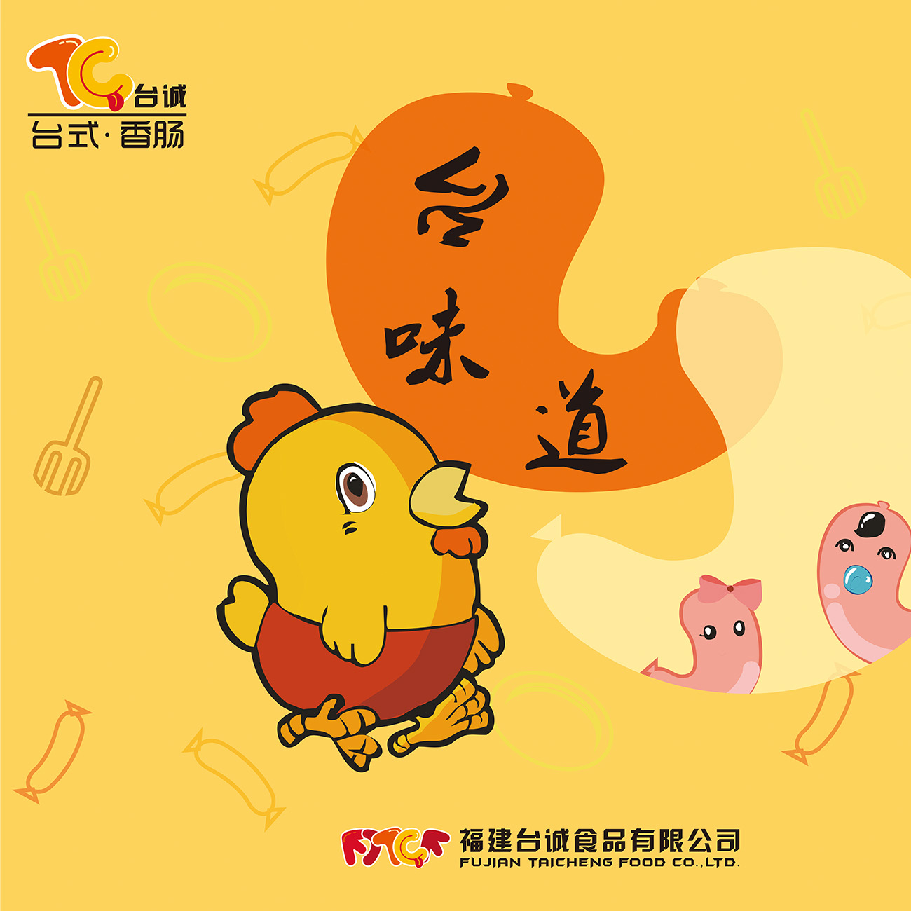 Logo 以企业名称“福建台诚食品有限公司”中的“福建台诚”入手,取其首字母进行组合,其圆润而富有动感的造型,隐喻企业的主打产品——台湾香肠,也使得标识与食品行业联系更深,C上的舌头装饰也更明确的表示出该企业为食品行业。